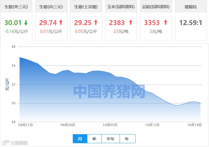 | 地区名称 | 外三元(元/公斤) | 内三元(元/公斤) | 土杂猪(元/公斤) | 玉米(元/吨) | 豆粕(元/吨) |
