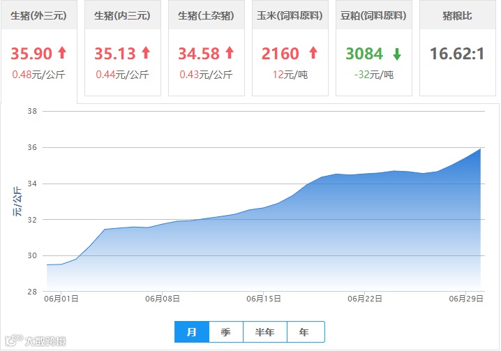 | 地区名称 | 外三元(元/公斤) | 内三元(元/公斤) | 土杂猪(元/公斤) | 玉米(元/吨) | 豆粕(元/吨) |