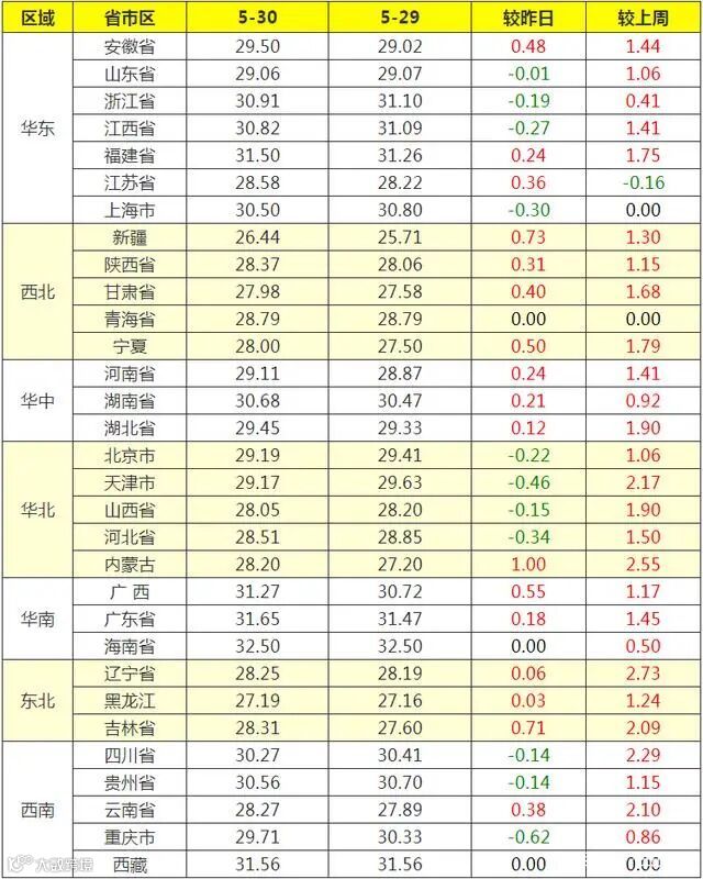 5月30日外三元猪价涨跌表(元/公斤):17涨,11跌。