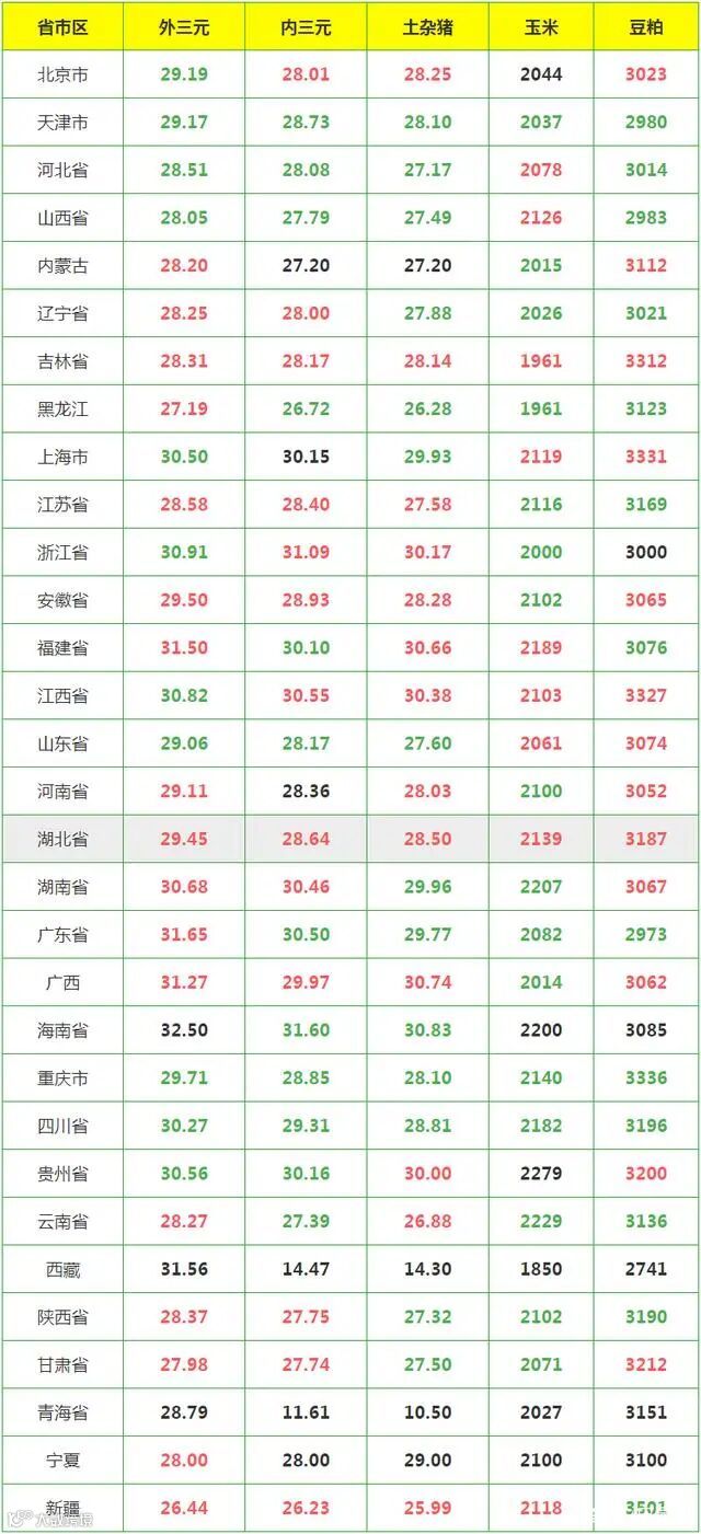 内三元生猪均价28.57元/公斤,较昨日下跌0.03元/公斤。内三元生猪涨幅最大为吉林,较昨日上涨0.64元/公斤。内三元生猪跌幅最大为重庆,较昨日下跌0.82元/公斤。内三元猪价最高为海南,价格为31.6元/公斤,较昨日下跌0.4元/公斤。