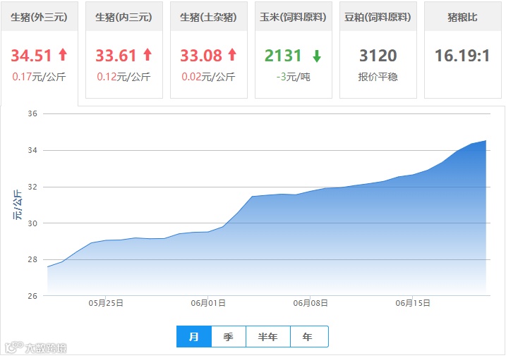 | 地区名称 | 外三元(元/公斤) | 内三元(元/公斤) | 土杂猪(元/公斤) | 玉米(元/吨) | 豆粕(元/吨) |