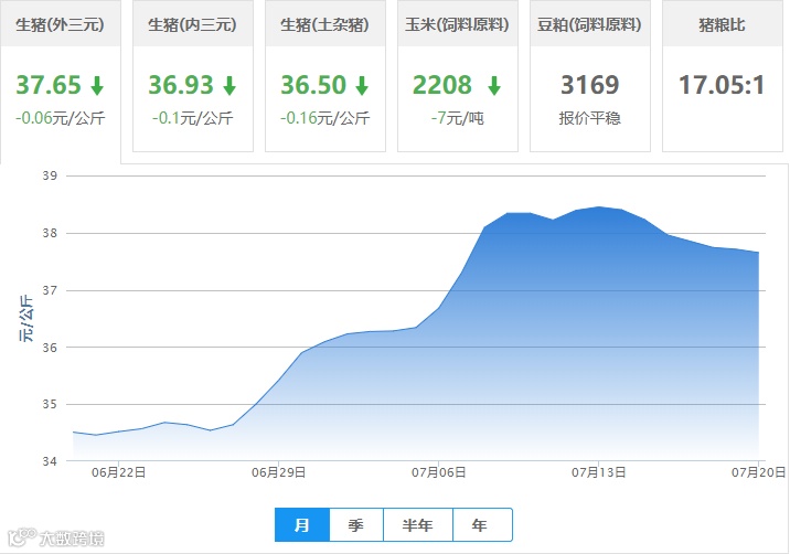 | 地区名称 | 外三元(元/公斤) | 内三元(元/公斤) | 土杂猪(元/公斤) | 玉米(元/吨) | 豆粕(元/吨) |