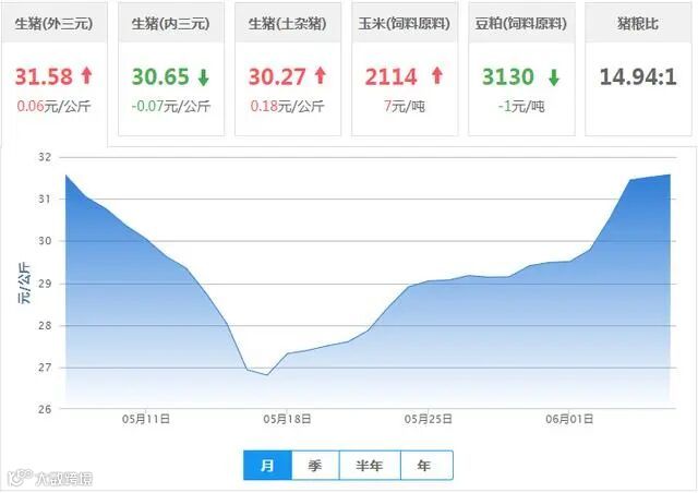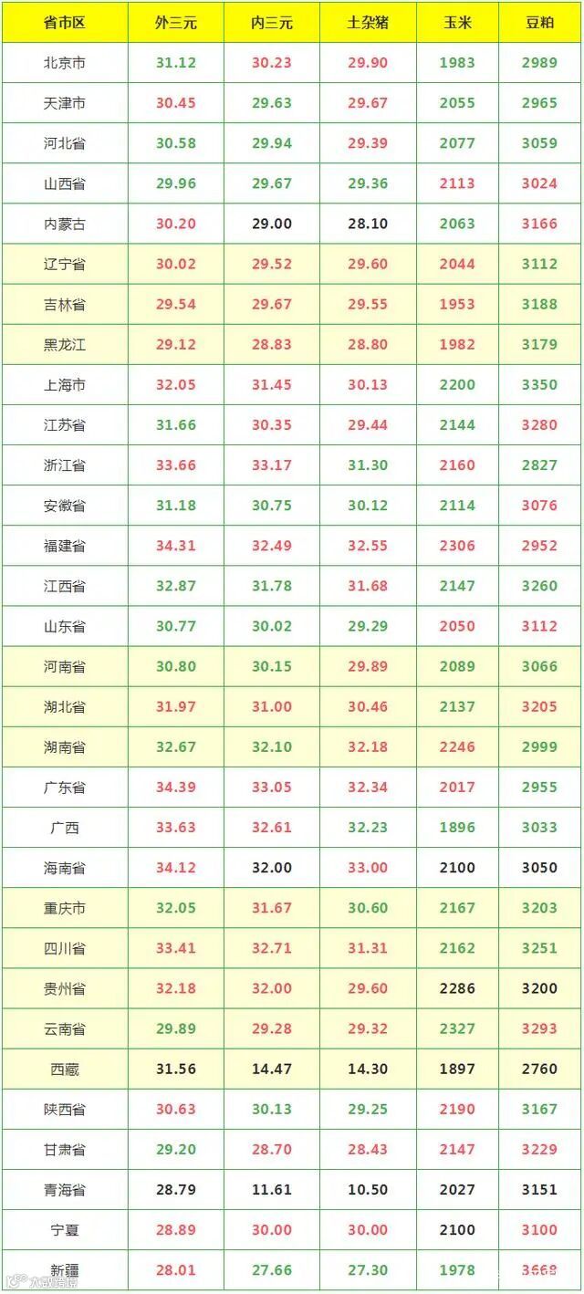 6月6日外三元生猪价格排行榜(元/公斤):8省区猪价在30元/公斤以下,今日猪价高低价差6.38元/公斤。