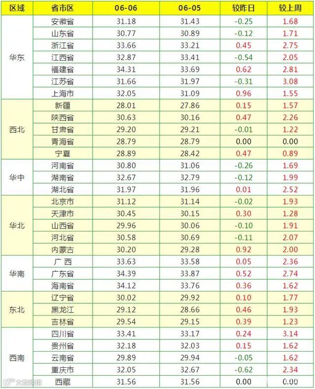 6月6日外三元猪价涨跌表(元/公斤):17涨,12跌,2稳。