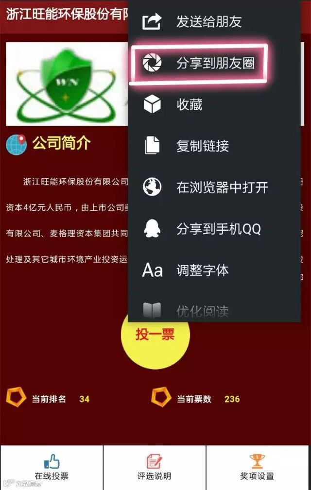 5、您还可以将此投票页面分享至朋友圈为我们旺能环保增添人气哦~