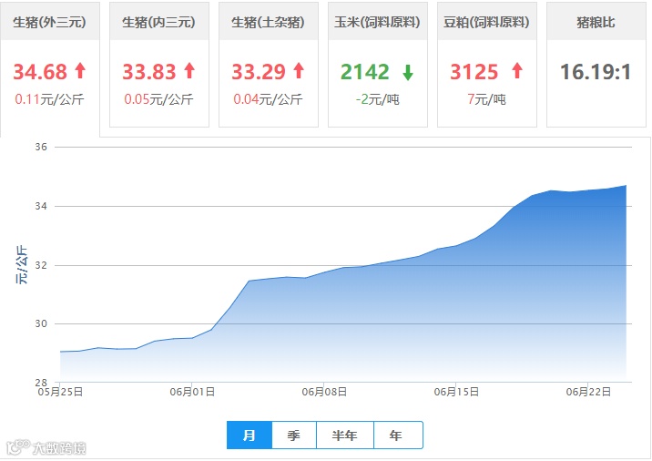 | 地区名称 | 外三元(元/公斤) | 内三元(元/公斤) | 土杂猪(元/公斤) | 玉米(元/吨) | 豆粕(元/吨) |