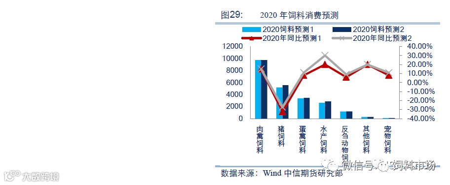 饲料的消费,预计生猪对饲料需求降幅19.4%-32.4%。肉禽对饲料需求增幅15%。蛋禽对饲料需求增幅8%-11%。水产对饲料需求增幅20%。2020年饲料消费总量预计同比变动-1.75%~+1.45%。