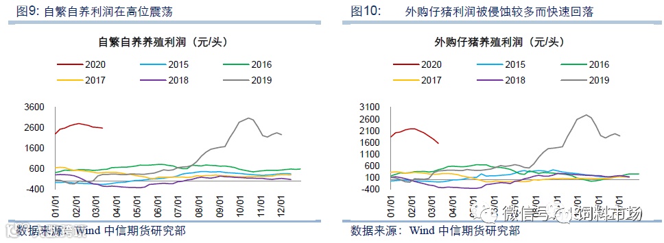 数据显示,春节后仔猪价格快速上涨,二元母猪价格则延续了2019年10月以来的涨势。从价格利润看,自繁自养生猪利润小幅回落,但基本在2600元/头高位震荡,成本优势明显。而外购仔猪养殖利润则明显回落至1700元/头,主因仔猪价格飙升侵蚀利润。尽管利润略有回落,但仍处于历史上最高水平,预计2020年生猪存栏和能繁母猪存栏还会进一步回升,从而猪肉供需缺口有所收敛,猪肉价格维持高位或缓步下行。