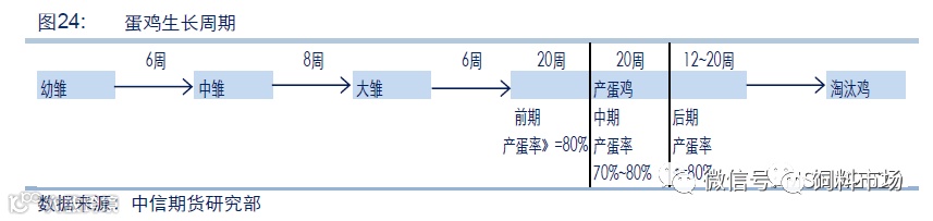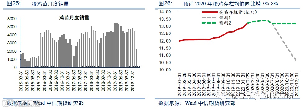 蛋鸡生长具有特定周期。蛋鸡的生命周期相对较长,从幼雏到淘汰鸡约504天~560天,即16.8~18.6个月。蛋鸡苗补栏20周后开始产蛋,整个产蛋期可持续52-60周。其中前20周为产蛋前期,中间20周为产蛋中期,最后12-20周为产蛋后期,择机淘汰。预计2020年价格相对高,养殖户会选择优势产蛋期,产蛋末期会及时淘汰。某时点的在产蛋鸡存栏量增量为5个月前补栏蛋鸡苗,减量为17个月前补栏蛋鸡苗。2020年蛋鸡存栏量依此进行测算。