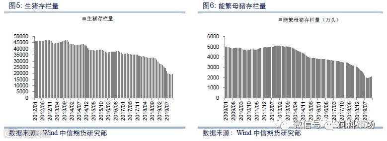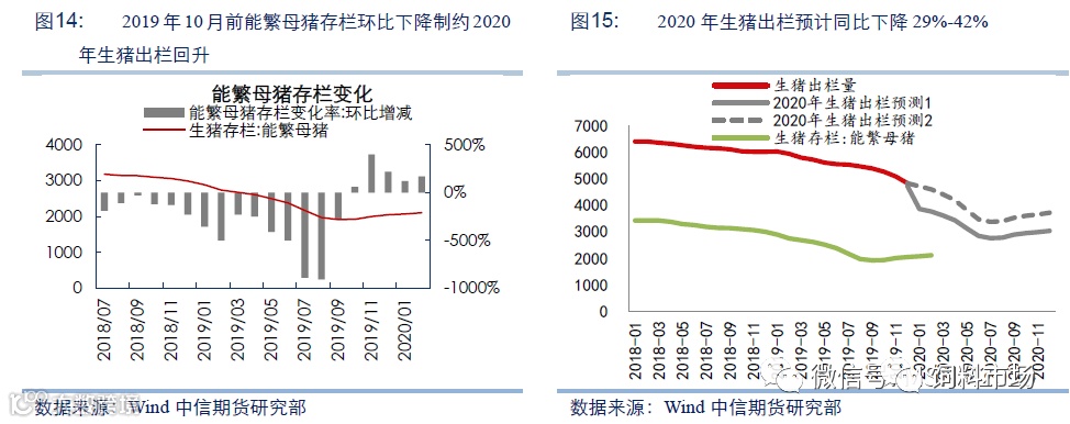 尽管政策和利润均利于能繁与生猪存栏回升,但受制于生猪生长周期,生猪存栏和出栏不可能一蹴而就。从后备母猪补栏到育肥猪出栏要经历12.6~13.7个月,母猪再孕到商品猪出栏要经历9.1-9.7个月。全国能繁母猪存栏2019年10月见底回升,对应到育肥猪出栏量预计2020年10月或11月才见底回升。2020年全年生猪出栏量由2019年3月-2020年2月能繁母猪存栏决定。