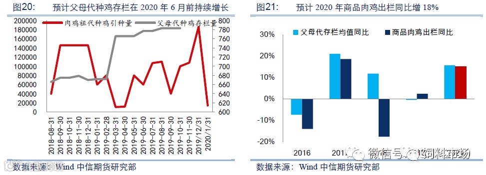 肉鸡生长具有特定周期。从父母代鸡引种到商品代肉鸡出栏大约234天,即7.8个月。而祖代种鸡引种到父母代种鸡苗孵化约189天,即6.3个月。由此,2019年5月-2020年4月的父母代存栏量决定了2020年肉鸡出栏量。
