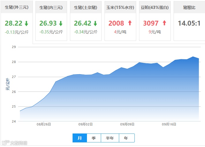 | 地区名称 | 外三元(元/公斤) | 内三元(元/公斤) | 土杂猪(元/公斤) | 玉米(元/吨) | 豆粕(元/吨) |
