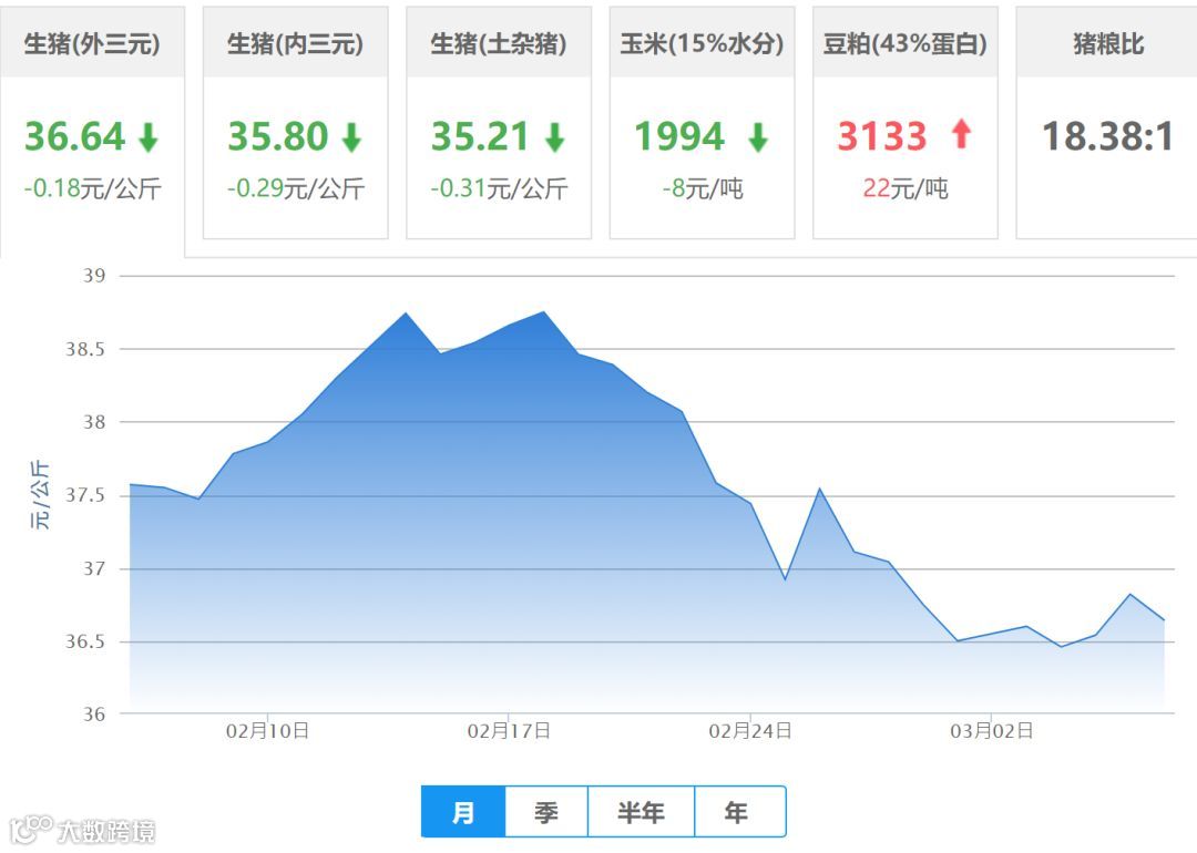 | 地区名称 | 外三元(元/公斤) | 内三元(元/公斤) | 土杂猪(元/公斤) | 玉米(元/吨) | 豆粕(元/吨) |