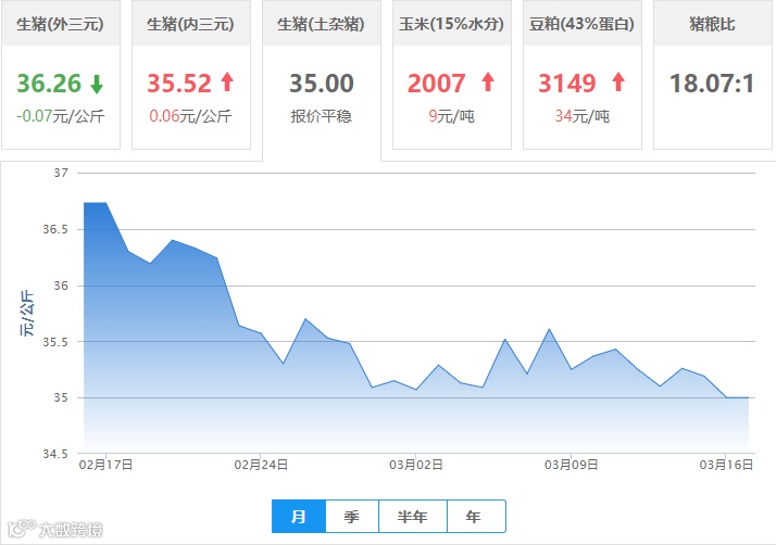 | 地区名称 | 外三元(元/公斤) | 内三元(元/公斤) | 土杂猪(元/公斤) | 玉米(元/吨) | 豆粕(元/吨) |