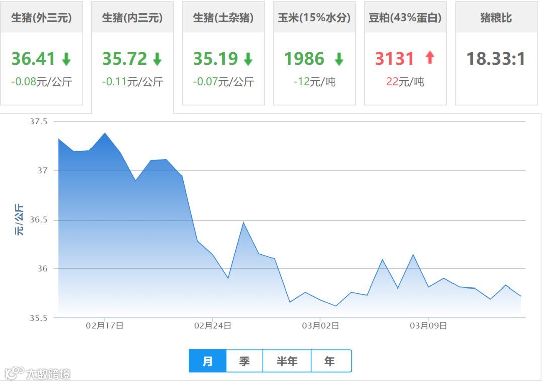 | 地区名称 | 外三元(元/公斤) | 内三元(元/公斤) | 土杂猪(元/公斤) | 玉米(元/吨) | 豆粕(元/吨) |