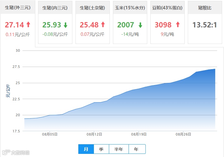 | 地区名称 | 外三元(元/公斤) | 内三元(元/公斤) | 土杂猪(元/公斤) | 玉米(元/吨) | 豆粕(元/吨) |