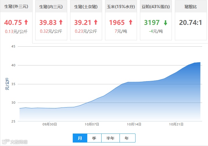 | 地区名称 | 外三元(元/公斤) | 内三元(元/公斤) | 土杂猪(元/公斤) | 玉米(元/吨) | 豆粕(元/吨) |