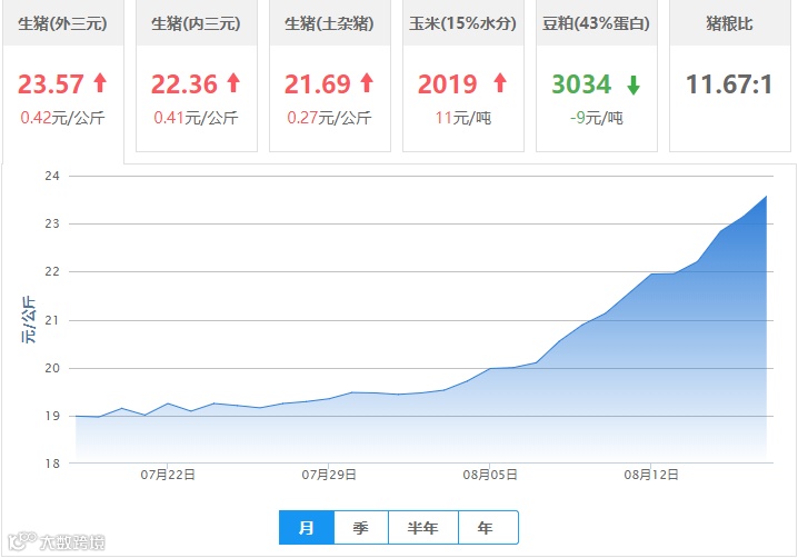 | 地区名称 | 外三元(元/公斤) | 内三元(元/公斤) | 土杂猪(元/公斤) | 玉米(元/吨) | 豆粕(元/吨) |