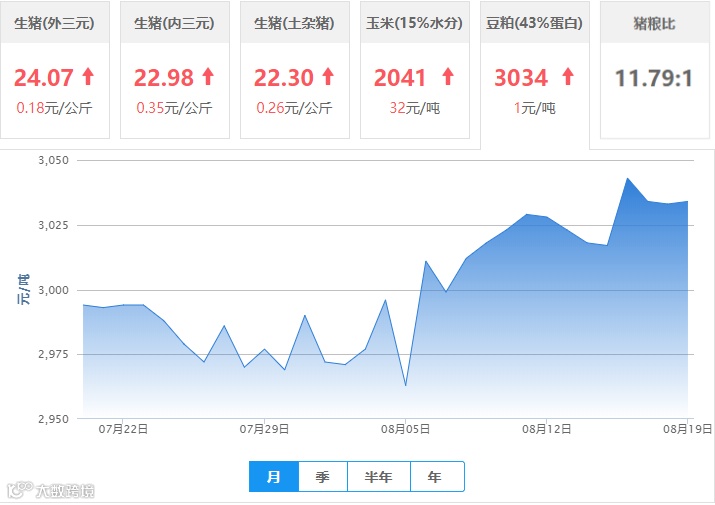 | 地区名称 | 外三元(元/公斤) | 内三元(元/公斤) | 土杂猪(元/公斤) | 玉米(元/吨) | 豆粕(元/吨) |