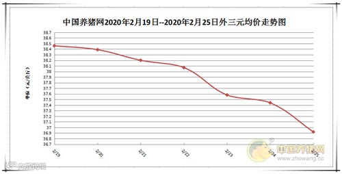 2020年2月25日,据中国养猪网猪价系统监测全国外三元均价为36.92元/公斤,价格较昨日下跌了0.52元/公斤。上周全国外三元均价为38.75元/公斤,今日较上周下跌了1.83元/公斤。内三元均价为35.90元/公斤,较昨日下跌了0.24元/公斤。土杂猪均价为35.30元/公斤,价格较昨日下跌了0.27元/公斤。