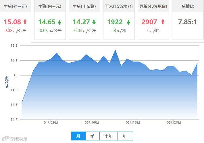 | 地区名称 | 外三元(元/公斤) | 内三元(元/公斤) | 土杂猪(元/公斤) | 玉米(元/吨) | 豆粕(元/吨) |