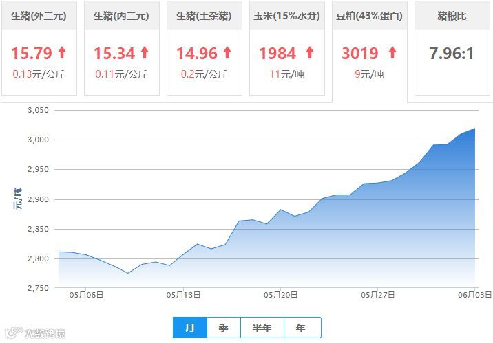 | 地区名称 | 外三元(元/公斤) | 内三元(元/公斤) | 土杂猪(元/公斤) | 玉米(元/吨) | 豆粕(元/吨) |