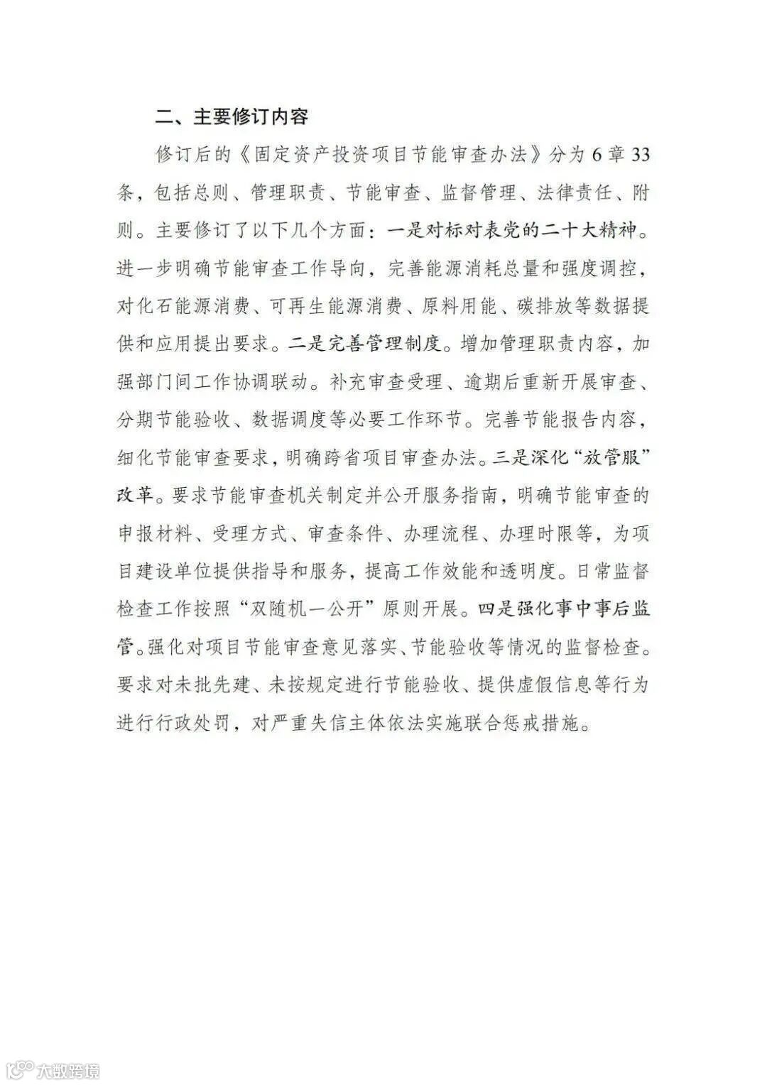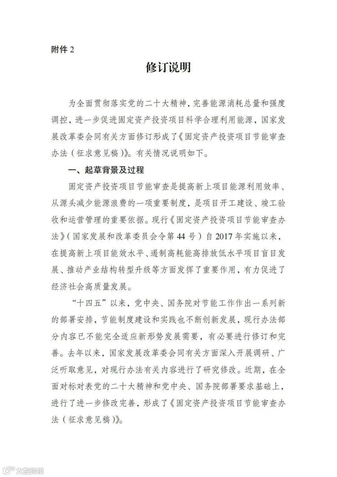 为全面贯彻落实党的二十大精神,完善能源消耗总量和强度调控,进一步促进固定资产投资项目合理利用能源,国家发展改革委会同有关方面在深入开展调研、广泛听取意见的基础上,修订形成了《固定资产投资项目节能审查办法(征求意见稿)》,现向社会公开征求意见。