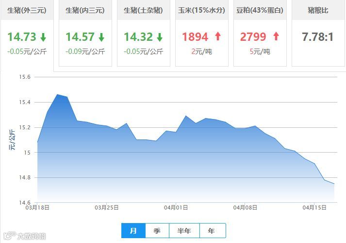 | 地区名称 | 外三元(元/公斤) | 内三元(元/公斤) | 土杂猪(元/公斤) | 玉米(元/吨) | 豆粕(元/吨) |