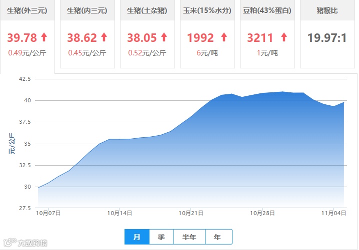 | 地区名称 | 外三元(元/公斤) | 内三元(元/公斤) | 土杂猪(元/公斤) | 玉米(元/吨) | 豆粕(元/吨) |