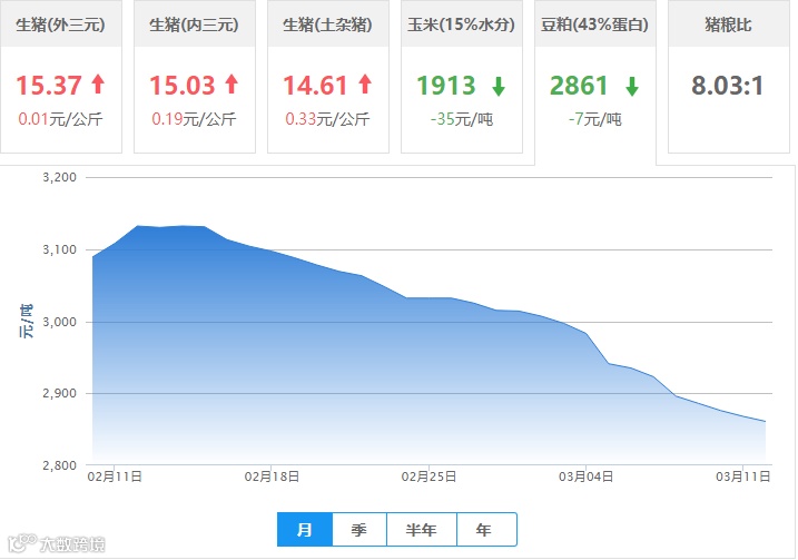 | 地区名称 | 外三元(元/公斤) | 内三元(元/公斤) | 土杂猪(元/公斤) | 玉米(元/吨) | 豆粕(元/吨) |