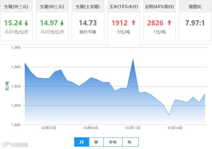 | 地区名称 | 外三元(元/公斤) | 内三元(元/公斤) | 土杂猪(元/公斤) | 玉米(元/吨) | 豆粕(元/吨) |