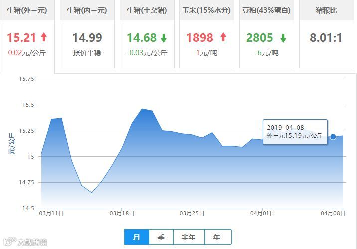 | 地区名称 | 外三元(元/公斤) | 内三元(元/公斤) | 土杂猪(元/公斤) | 玉米(元/吨) | 豆粕(元/吨) |