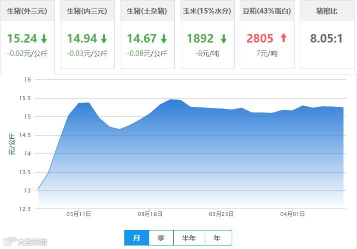 | 地区名称 | 外三元(元/公斤) | 内三元(元/公斤) | 土杂猪(元/公斤) | 玉米(元/吨) | 豆粕(元/吨) |