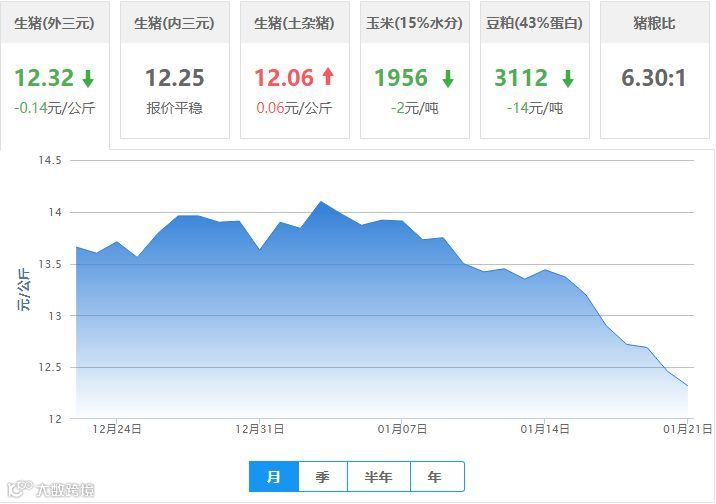 | 地区名称 | 外三元(元/公斤) | 内三元(元/公斤) | 土杂猪(元/公斤) | 玉米(元/吨) | 豆粕(元/吨) |