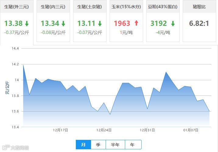 | 地区名称 | 外三元(元/公斤) | 内三元(元/公斤) | 土杂猪(元/公斤) | 玉米(元/吨) | 豆粕(元/吨) |