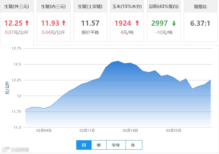 | 地区名称 | 外三元(元/公斤) | 内三元(元/公斤) | 土杂猪(元/公斤) | 玉米(元/吨) | 豆粕(元/吨) |
