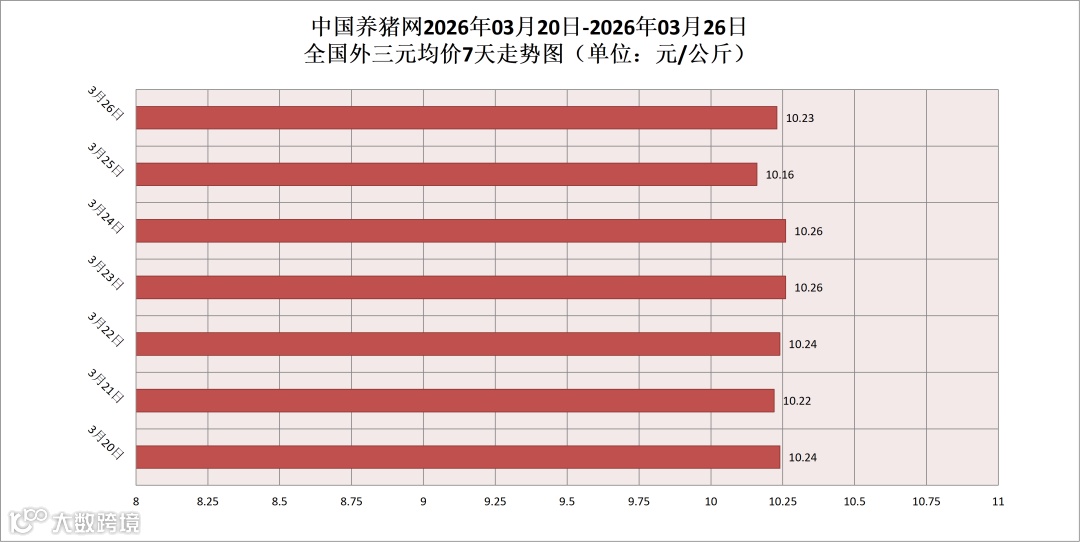 2026年03月26日(星期四),据中国养猪网猪价系统监测,全国外三元均价为10.23元/公斤,猪价较昨日(10.16元/公斤)上涨0.07元/公斤,较上月(11.51元/公斤)下跌了1.28元/公斤。
