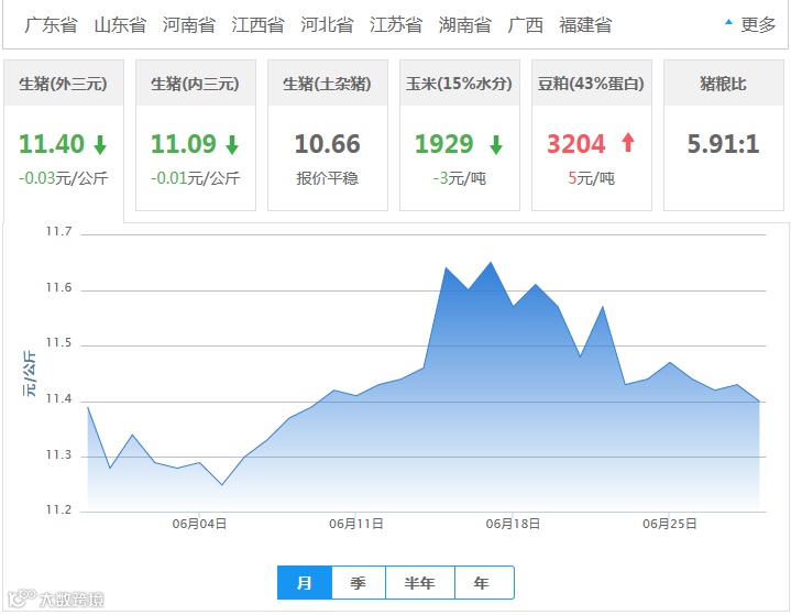 2018年07月02日全国外三元生猪价格行情涨跌表
