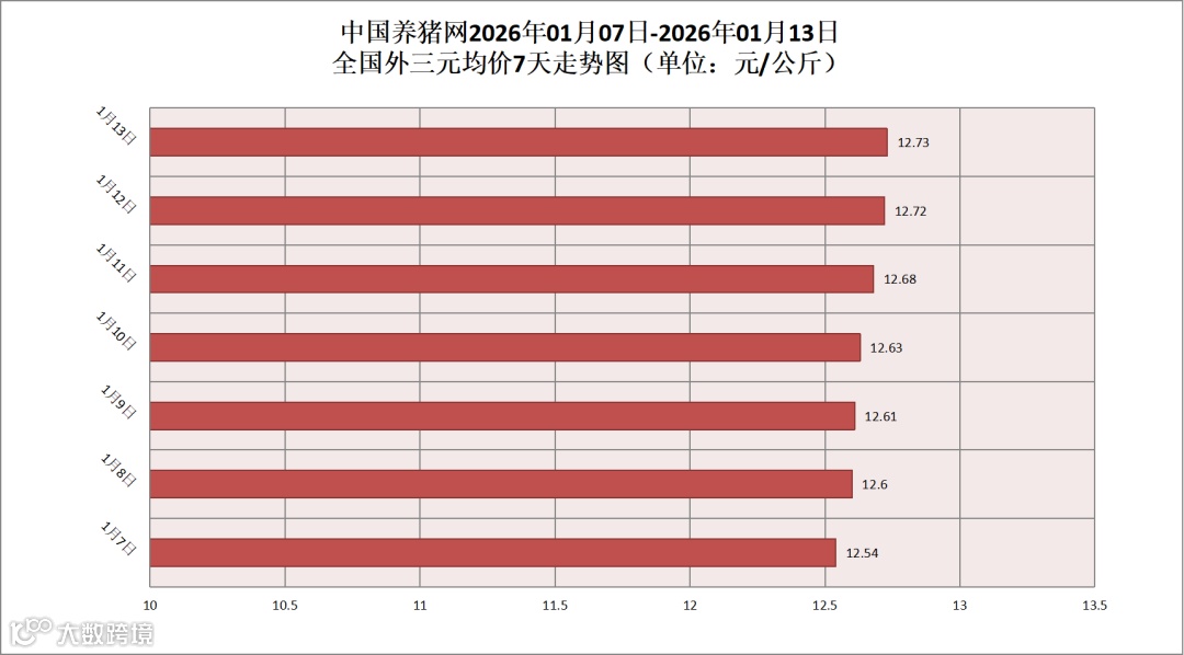 2026年01月13日(星期二),据中国养猪网猪价系统监测,全国外三元均价为12.73元/公斤,猪价较昨日(12.72元/公斤)上涨0.01元/公斤,较上月(11.51元/公斤)上涨了1.22元/公斤。