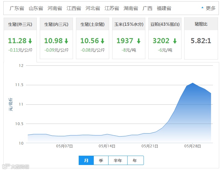 2018年05月31日全国外三元生猪价格行情涨跌表