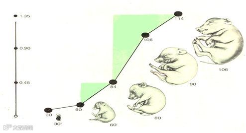 妊娠期胎儿的生长规律是前期慢、后期快、最后更快,胎儿体重的2/3是在最后1/4期形成的,简单说在母猪怀孕后期(85天后),胚胎的生长速度最快,大约前期长1斤,85天后长2斤。于是我们往往在母猪怀孕后期通过增加饲料中的能量、蛋白浓度(从怀孕料改喂哺乳料或者怀孕后期料),增加母猪的饲喂量,来增加仔猪初生重。这也就是我们平常所谓的“攻胎”。