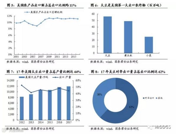 大豆出口对美国政治意义重大。2014-2017年位居美国大豆生产前10位的州为伊利诺伊州、艾奥瓦州、明尼苏达州、内布拉斯加州、印地安纳州、密苏里州、俄亥俄州、北达科塔州、南达科他州和阿肯色州,这10个州大豆生产占全美的95%,在2016年美国大选中,有8大农业州都支持特朗普,是其重要票仓地区。如果中国对美国大豆采取提高关税,预计美国大豆主产州经济将受到严重打击,并对特朗普支持度及未来连任构成负面影响。