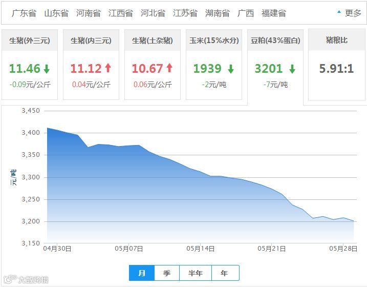 2018年05月29日全国外三元生猪价格行情涨跌表