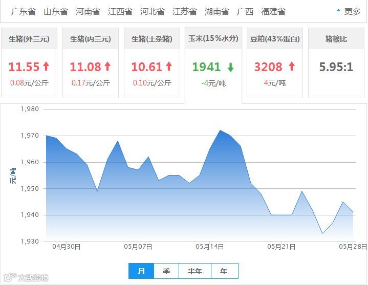 2018年05月28日全国外三元生猪价格行情涨跌表