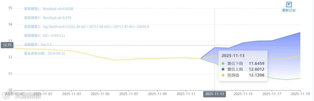 玄田算法是由项目课题组团队原创的非经典逻辑数值聚合理论和不确定性预测方法,构建了基于一致模算子的生猪价格预测模型。该模型采用的聚合函数及一致模相关理论与方法已获得多项国家自然科学基金和省级自然科学资金资助,并获得多项省级自然科学奖奖项。11月13日预测猪价为12.1208,置信区间在11.6459--12.6012之间。11月14日预测猪价为11.9051;11月15日预测猪价为12.0600。