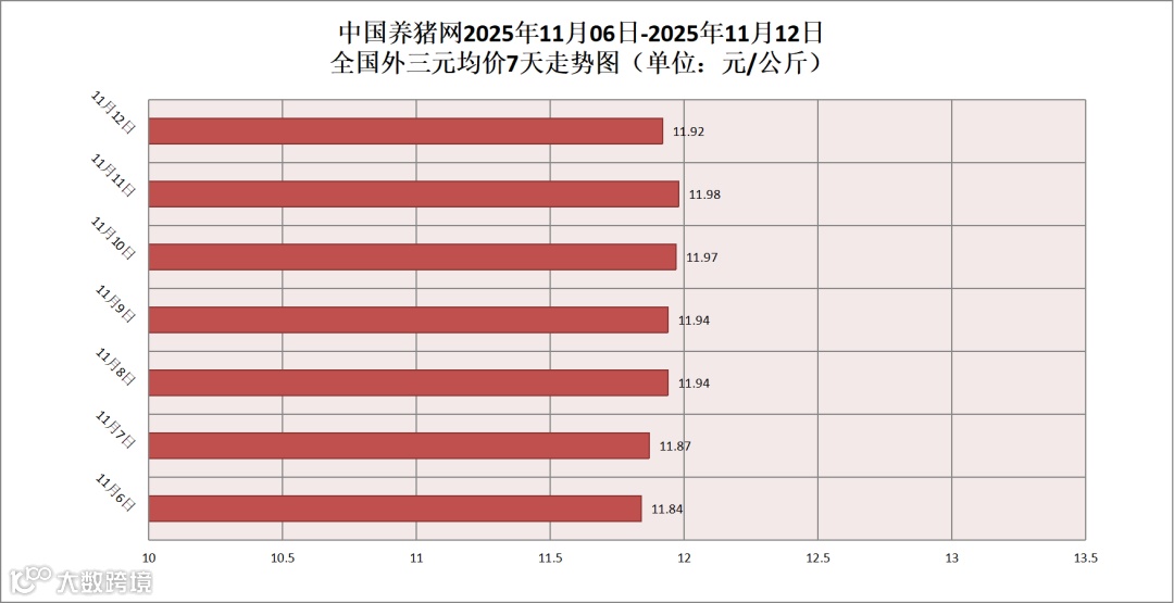 2025年11月12日(星期三),据中国养猪网猪价系统监测,全国外三元均价为11.92元/公斤,猪价较昨日(11.98元/公斤)下跌了0.06元/公斤,较上月(10.94元/公斤)上涨了0.98元/公斤。