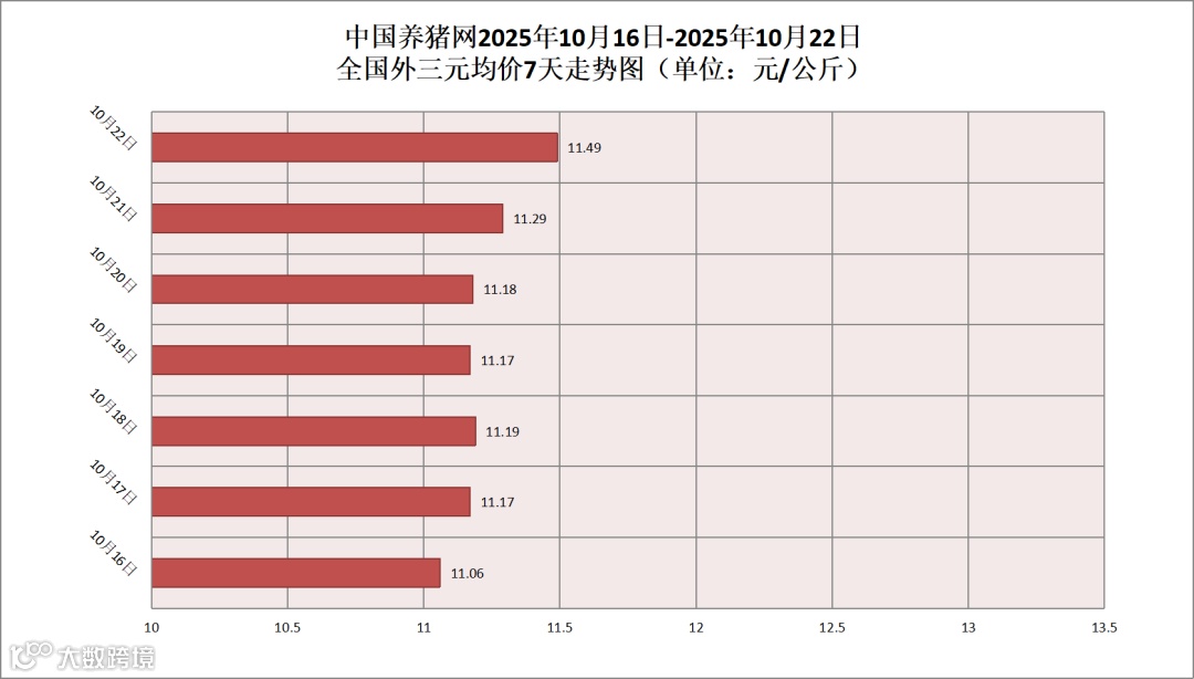 2025年10月22日(星期三),据中国养猪网猪价系统监测,全国外三元均价为11.49元/公斤,猪价较昨日(11.29元/公斤)上涨了0.20元/公斤,较上月(12.74元/公斤)下跌了1.25元/公斤。