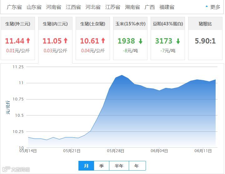 2018年06月13日全国内三元生猪价格行情涨跌表