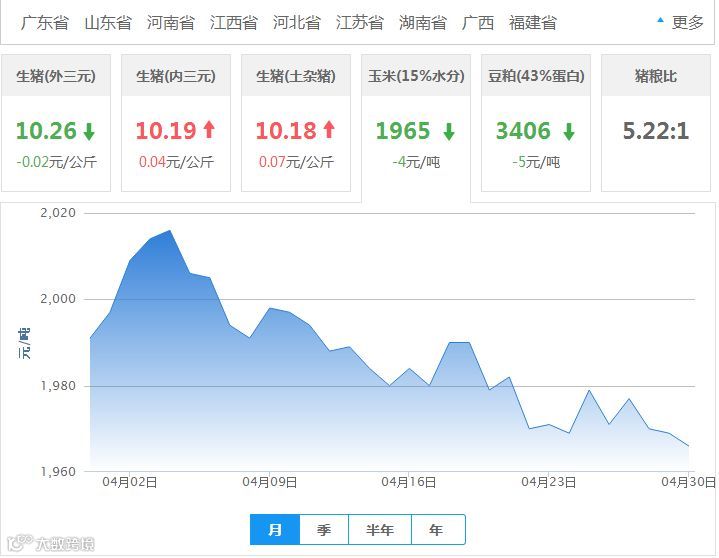 2018年04月30日全国外三元生猪价格行情涨跌表