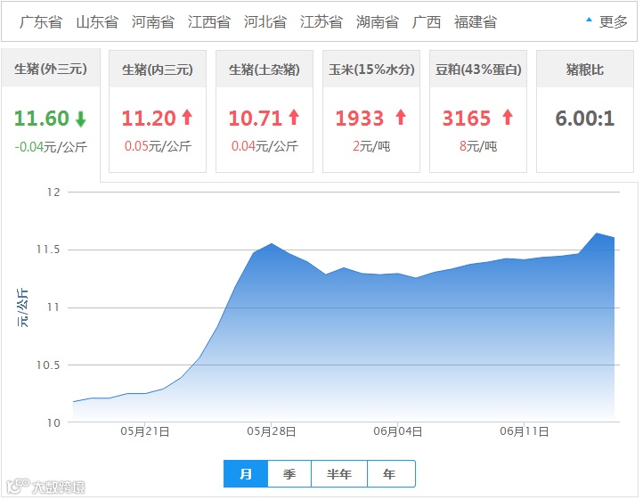 2018年06月16日全国外三元生猪价格行情涨跌表